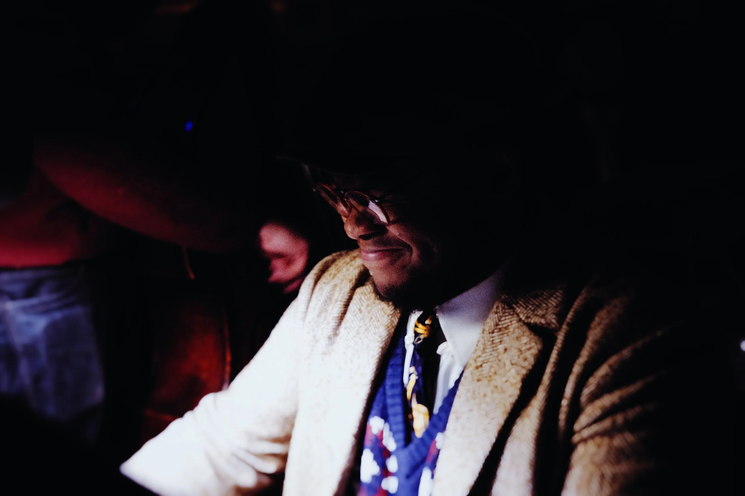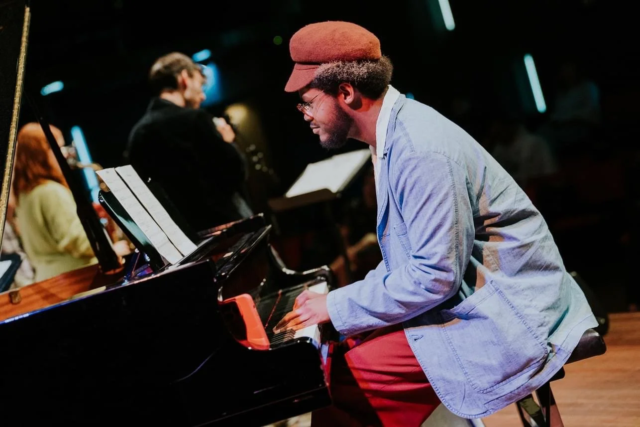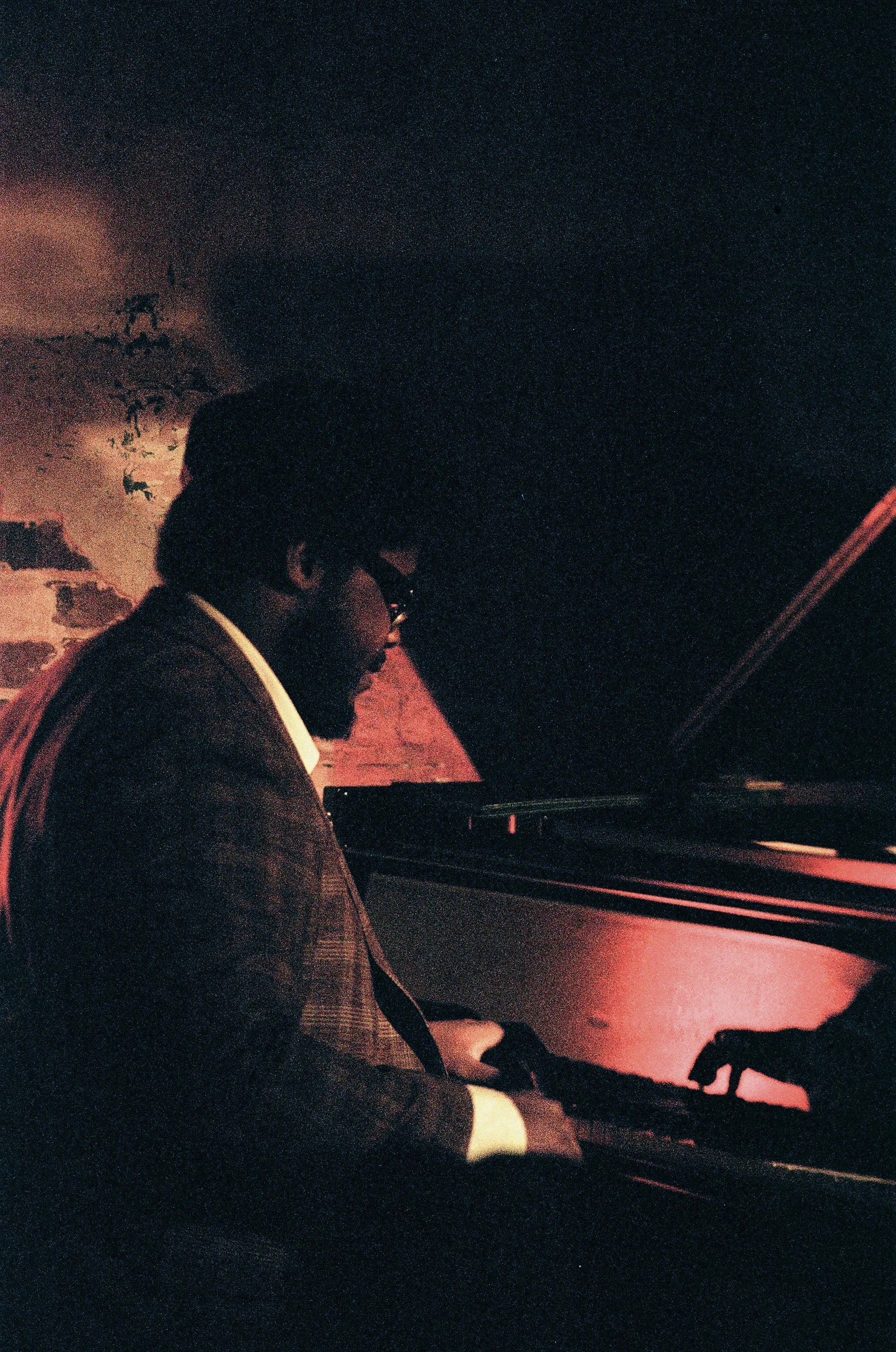 Black and white photo of a young man in a checked blazer, lace shirt, glasses, and a cap, sitting at a piano with his left arm resting on the keys.